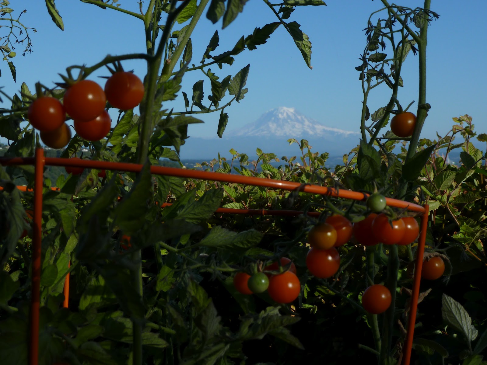 Picking tomatoes in my garden late this afternoon I was transfixed to see Mt. Rainier framed by the tomato plants and the frame used to hold them vertical.  There between the tomatoes and the bird bath ... another view of "the mountain".  I always say that no matter where you go in this area ... if there is a view of the mountain, it will look different than the one you saw from a different vantage point ... even a few minutes ago.
